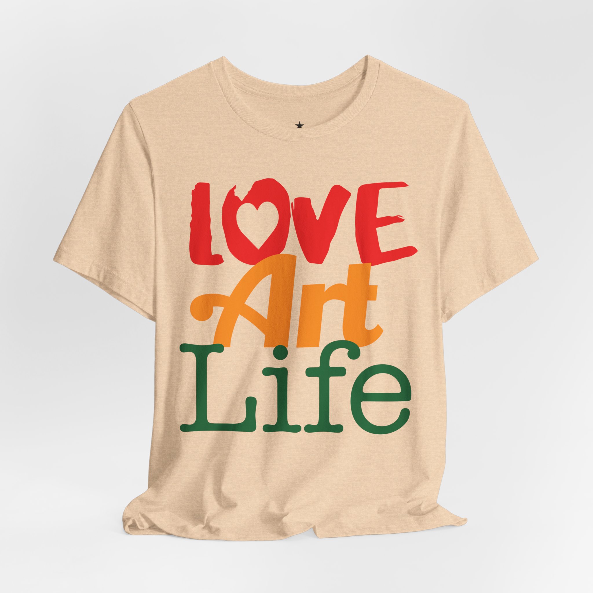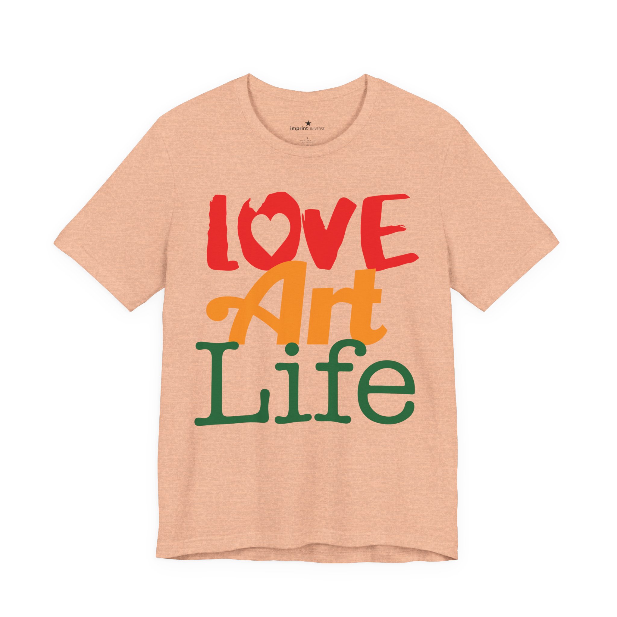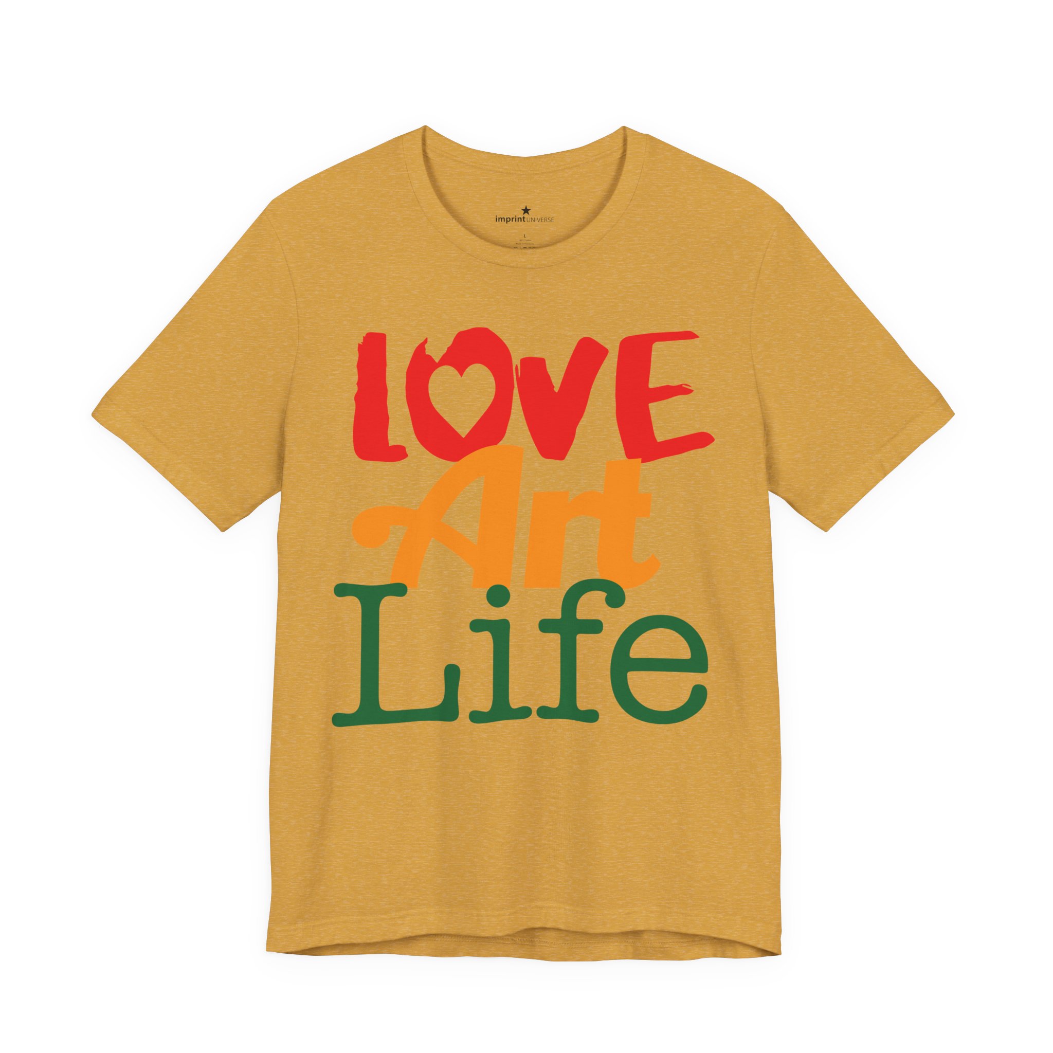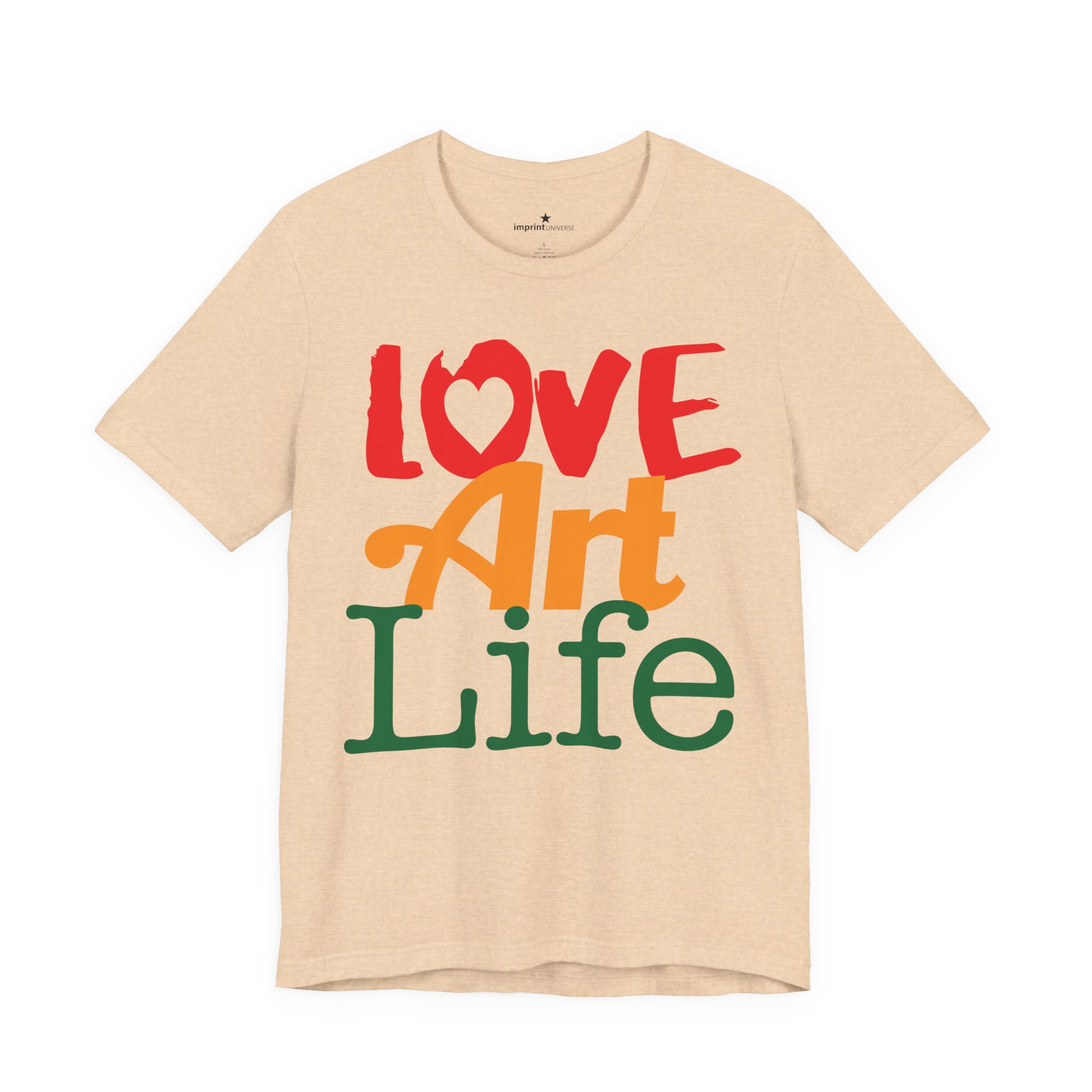 This lightweight jersey tee wears like a warm conversation—soft, breathable, and written in color. Bold hand-lettered type spells out Love, Art, Life in playful, sun-warmed hues that feel like a studio morning: paint-stained hands, coffee at the easel, and music in the background. The retail cut keeps the silhouette clean for layering under jackets or wearing solo during gallery visits, craft markets, and casual meetups with fellow makers. Thoughtful details—soft Airlume combed cotton, tear-away label, ribbed collar, and reinforced shoulder tape—mean it moves with you through long days of creating without fuss. Ethically produced and REACH certified, it’s made to be lived in, washed, and worn again as you keep showing up for the work you love.