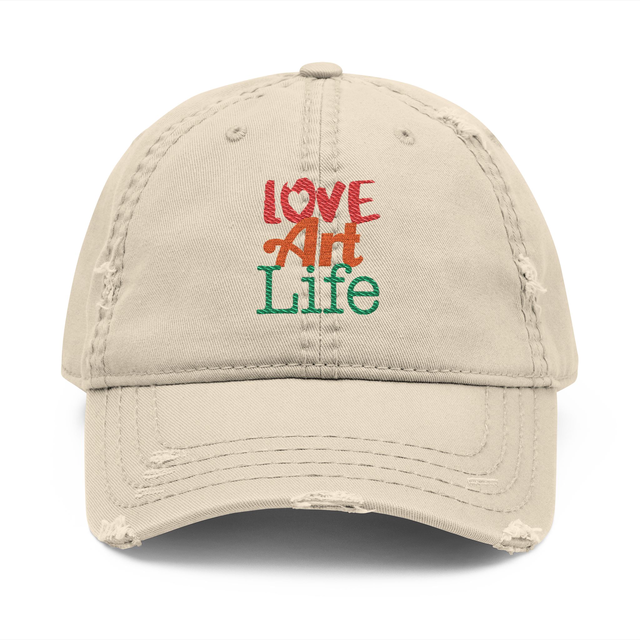 This relaxed, distressed cotton cap feels like a long-worn favorite from the moment you put it on. Faded charcoal twill, soft low-profile crown, and purposeful wear marks give it lived-in character. The embroidered “Love Art Life” motif in warm, painterly colors adds a handmade, creative touch that reads like a quiet declaration—subtle but unmistakable. The adjustable hook-and-loop strap lets it sit just right after days on the move, studio sessions, or slow coffee mornings. Wear it to anchor a casual outfit, shield your eyes while sketching outdoors, or bring a little creative confidence to weekend errands.